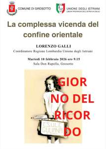 Martedì 10 febbraio, alle ore 9.15, il nostro Coordinatore regionale per la Lombardia, Lorenzo Galli, terrà una conferenza con la partecipazione delle scuole nella Sala Don Rapella a Grosotto (Sondrio). Una bella iniziativa del Comune e dell’Unione degli Istriani, nello spirito della Legge istitutiva del Giorno del Ricordo.
