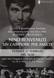 Vi aspettiamo numerosi alla prima a Trieste del docufilm dello splendido Gianni Virgadaula dedicato al nostro campione di pugilato Nino Benvenuti, scomparso lo scorso anno. La proiezione avrà luogo nella Sala Maggiore della sede di Palazzo Tonello a Trieste alla presenza del regista, delle autorità e di alcuni parenti di Nino residenti nel capoluogo giuliano. Campione olimpico dei pesi welter…