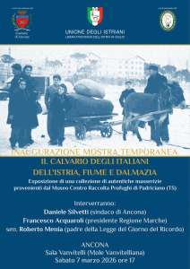 Si è svolta sabato 7 marzo, nella splendida sala Vanvitelli sita presso la Mole Vanvitelliana ad Ancona, l’inaugurazione della mostra intitolata "Il calvario degli italiani dell'Istria, Fiume e Dalmazia" che espone una campionatura di masserizie originali delle collezioni del Museo di Carattere Nazionale C.R.P. di Padriciano. Una straordinaria partecipazione di pubblico ha sottolineato l’interesse della città per questa iniziativa del…