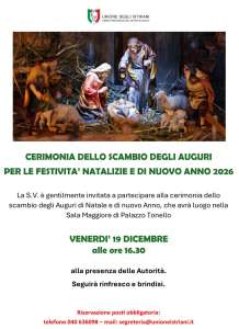 Venerdì 19 dicembre, alle ore 16.30, nella sede di Palazzo Tonello in via Silvio Pellico 2 a Trieste, si svolgerà la tradizionale cerimonia per lo scambio degli auguri di Natale, alla presenza delle autorità. L’appuntamento sarà, come ogni fine anno, anche l’occasione per fare il punto sulle tante attività svolte nel 2025 e rispetto a quelle in programma per il…