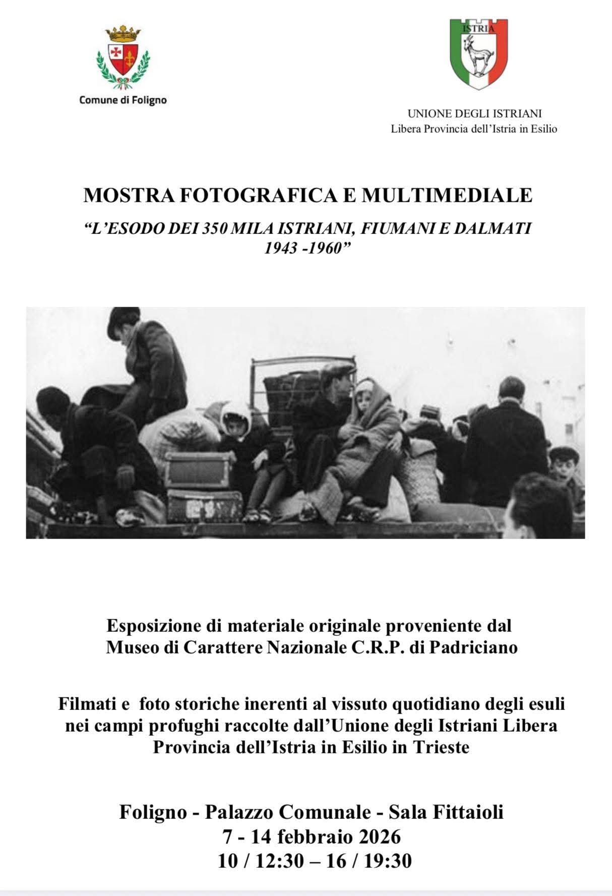 Si inaugura sabato 7 febbraio a Foligno (Perugia) la mostra intitolata “L’Esodo dei 350 mila Istriani, Fiumani e Dalmati 1943-1960”, realizzata dall’Unione degli Istriani con il sostegno ed il patrocinio dell’Amministrazione comunale.