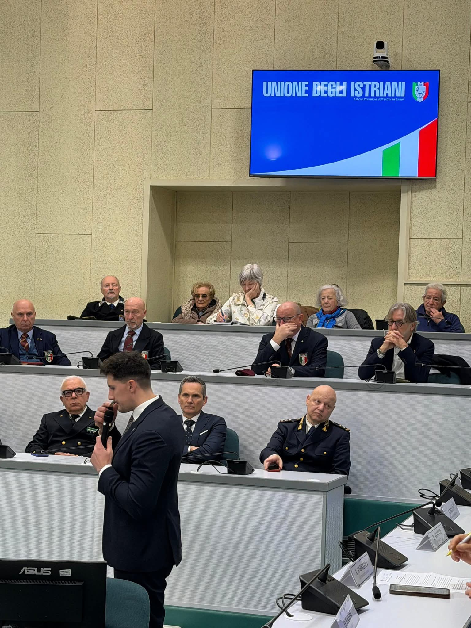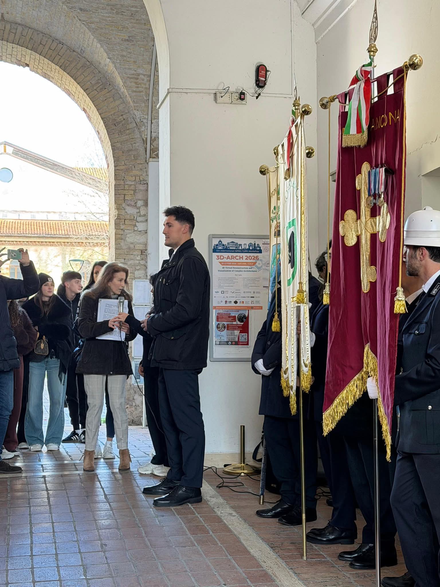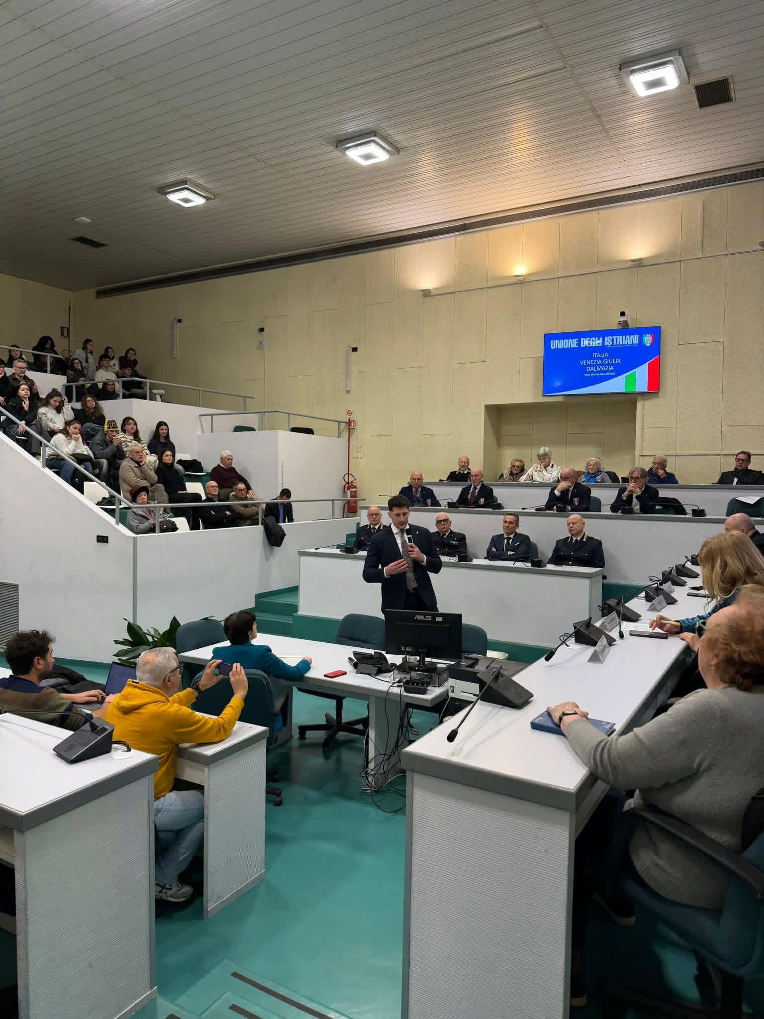 La commemorazione è poi proseguita presso la sala consiliare del Comune di Ancona dove il nostro Coordinatore regionale per le Marche, Emanuele Piloni, ha ripercorso con puntualità la storia del Confine orientale, accompagnando gli studenti e le autorità presenti alla scoperta della millenaria storia della Venezia Giulia e della Dalmazia, dall’epoca romana e veneziana fino ai tragici giorni delle Foibe e dell’Esodo, concludendo l’excursus con il racconto della storia della propria nonna, esule da Pisino.