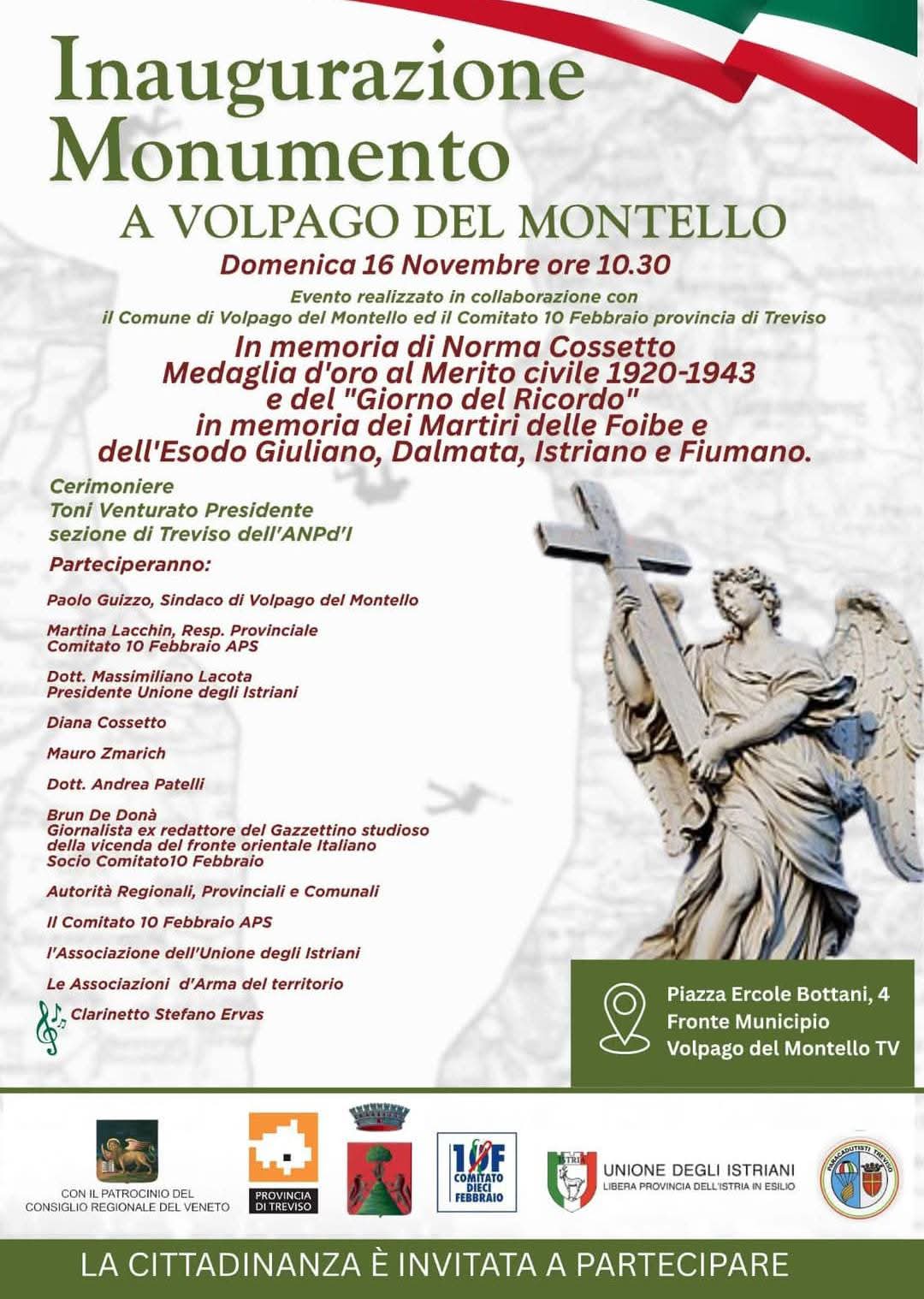 Dedicato a Norma Cossetto ed ai Martiri delle Foibe è il cippo inaugurato domenica 16 mattina a Volpago del Montello (Treviso), nel piazzale davanti al Municipio.